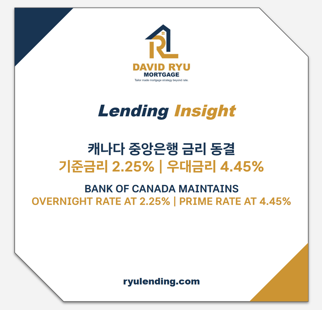 [캐나다 중앙은행 금리 동결 - OVERNIGHT RATE 2.25% | PRIME RATE 4.45%]